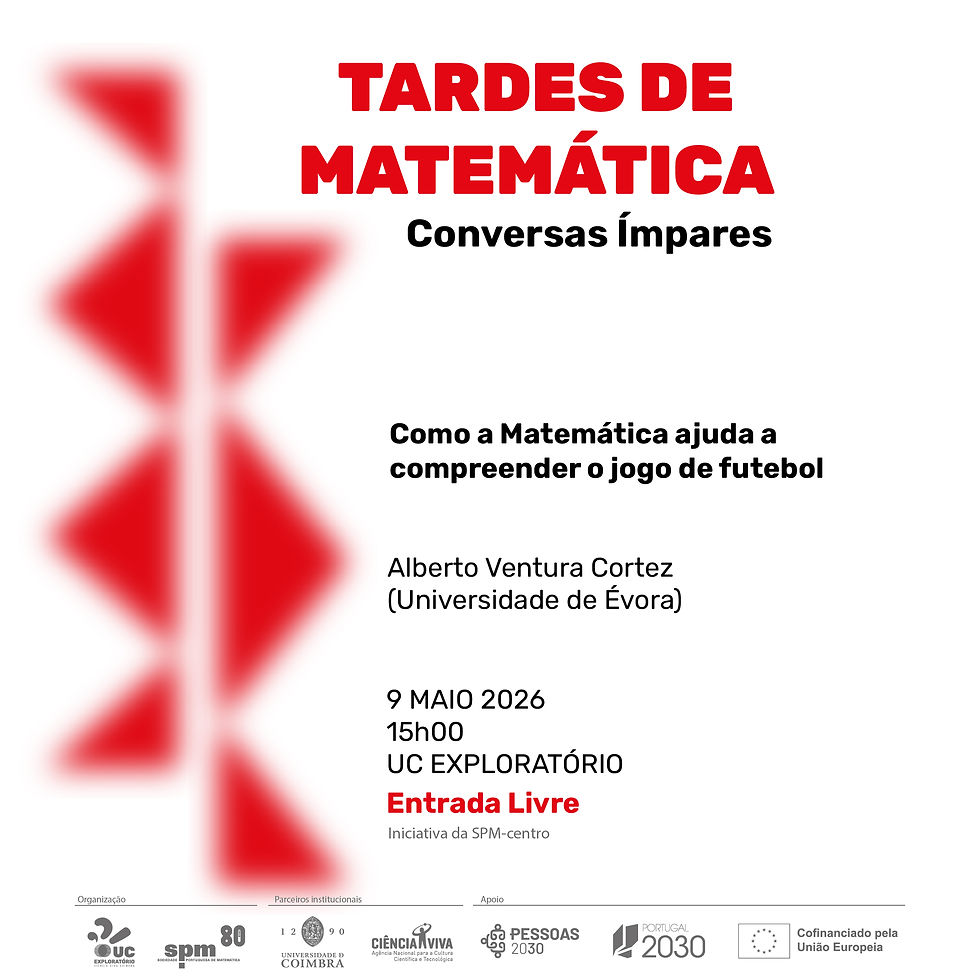A 9 de de maio, sábado, às 15h00, prosseguimos o ciclo Tardes de Matemática - Conversas ímpares, com entrada livre no UC Exploratório. Nesta sessão, o convidado é Alberto Jorge Ventura Cortez, professor na Escola de Saúde e Desenvolvimento Humano, Departamento de Desporto e Saúde da Universidade de Évora, que irá abordar o tema: Como a matemática ajuda a compreender o jogo de futebol.